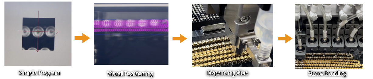 Gluing & Stone Placement System – to dispense glue and accurately pick and place stones with rotary nozzles.